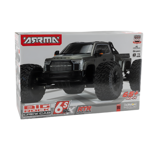 Built on the proven 6S BLX platform and supersized to 1/7 scale, the ready-to-run BIG ROCK™ 6S BLX 4×4 blasts like only a large-scale ARRMA® RC monster truck can — especially when amped up with Spektrum™ brushless power and topped with an eye-catching crew cab body. Featuring loads of realistic scale details and “stealth” black-anodized aluminum parts, the ARRMA BIG ROCK 6S BLX is big, fierce, fast, and tough.