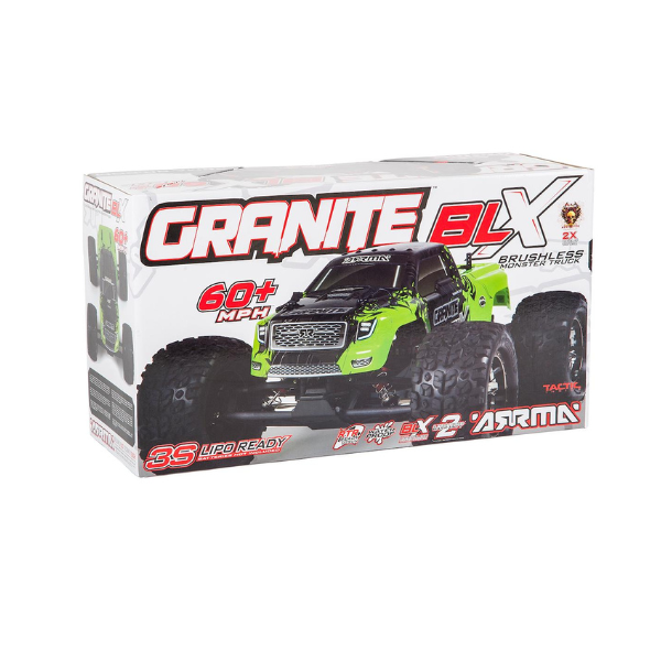 | Description | The Arrma 1/10 Granite 4X4 V3 3S BLX Brushless 4WD Monster Truck delivers jaw-dropping power and 50+ MPH brushless performance. Precision aluminum, tough steel and composite materials come together for an easy-to-maintain, super-durable vehicle design that’s now upgraded for even greater performance and durability.
