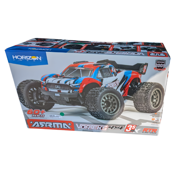 The Arrma Vorteks 4X4 3S BLX represents the highest level of speed and technology found yet in the proven tough ARRMA 4X4 platform. The Vortex 4×4 includes a 2S or 3S compatible Spektrum Firma 3200Kv brushless motor, and is a rocket right out of the box. Using a 3S LiPo battery and an optional pinion gear, it is the first ARRMA 4X4 3S BLX model capable of 60mph and more!