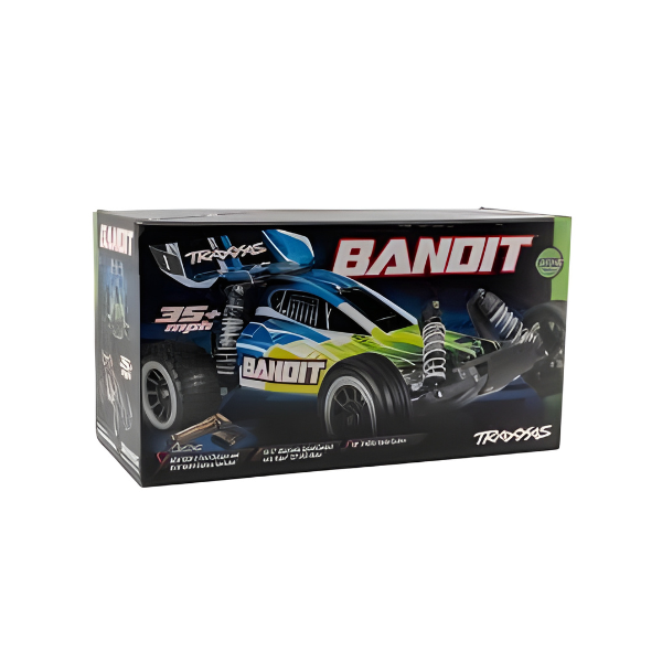 The Traxxas Banditโข redefines traditional buggy performance by creating a whole new class of Extreme Sports Buggyโข. Bandit offers the highest levels of speed, action, and fun that will easily make it one of your favorites for all kinds of R/C driving excitement. The lightweight Bandit chassis is loaded with an aggressive Titanยฎ 12-Turn modified motor and a high-current XL-5 Electronic Speed Control that deliver lightning-fast acceleration and incredible 35+mph* performance. Pull the trigger and Bandit rips massive rooster tails, soars over giant jumps, and lays down the power for pure performance and excitement at every turn. Bandit is infused with the latest tech including the patent-pending Revoยฎ-Spec Torque-Controlโข slipper clutch and Aliasโข high-performance 2.2″ racing tires. The advanced dual-pin rear, and ribbed front tread designs are engineered to work with our exclusive rubber compounds for superior off-road traction and directional control.