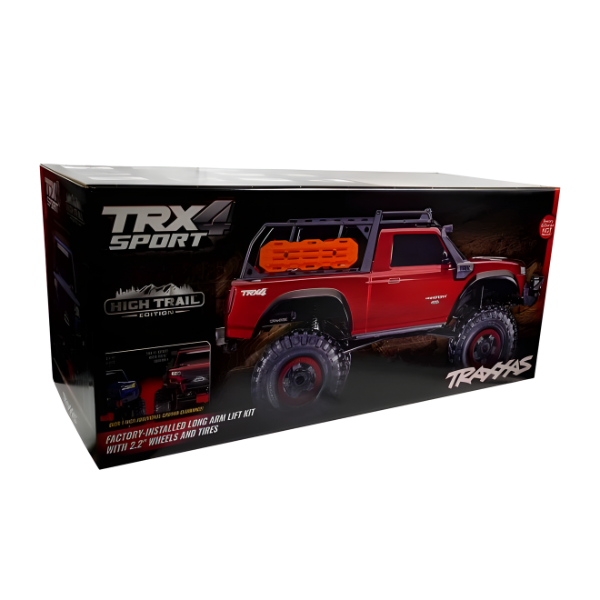 This is Traxxas 1/10 4WD Sport High Trail Truck Red Edition RTR EP w/ LED Lights TQ 2.4GHz Radio. Even the toughest off-road challenges have met their match with TRX-4ยฎ Sport High Trailโข Edition. A factory-installed Long Arm Lift Kit amplifies TRX-4 Sportโs performance-focused all-terrain capability with even more ground clearance. High-angle bumpers and fully-locked axles provide nearly unstoppable climbing versatility with the show-stopping looks of the High Trail Editionโs rugged Expedition Rack and scale accessories.